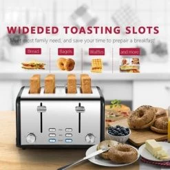 Use 4-Slice Toaster to bake perfect slices of bread. This toaster is made of stainless steel, which is strong and durable. This toaster has a variety of finishes for you to choose from. It has four automatically adjustable slots, which can bake four slices of bread conveniently. This 4-slice toaster has an automatic power-off function, which can stop the process when the toast gets stuck, ensuring that toasts, bagels, muffins, etc. are brown every time it is used. The toaster provides a thawing setting for baking frozen foods, a reheat setting for heating previously baked foods, and a bagel setting for heating the outside and baking the bagel sections. The deep and wide slot can easily put all kinds of bread and take it out. This toaster has a power indicator light. This toaster can be easily cleaned with a soft dry cloth. It saves space and fits any kitchen counter whether it is placed on the side or facing forward. Two crumb trays in the rear of the toaster to collect the bread crumbs, and they can be easily removed and cleaned.