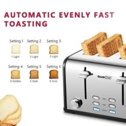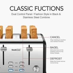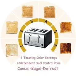 Use 4-Slice Toaster to bake perfect slices of bread. This toaster is made of stainless steel, which is strong and durable. This toaster has a variety of finishes for you to choose from. It has four automatically adjustable slots, which can bake four slices of bread conveniently. This 4-slice toaster has an automatic power-off function, which can stop the process when the toast gets stuck, ensuring that toasts, bagels, muffins, etc. are brown every time it is used. The toaster provides a thawing setting for baking frozen foods, a reheat setting for heating previously baked foods, and a bagel setting for heating the outside and baking the bagel sections. The deep and wide slot can easily put all kinds of bread and take it out. This toaster has a power indicator light. This toaster can be easily cleaned with a soft dry cloth. It saves space and fits any kitchen counter whether it is placed on the side or facing forward. Two crumb trays in the rear of the toaster to collect the bread crumbs, and they can be easily removed and cleaned.