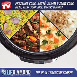 - 16 ways to cook: Quick Release, Delay Start, Smart Release, Slow Cook, Soup/Broth, Bean/Chili, Meat/Stew, Poultry, Multigrains, Oatmeal, Yogurt, Sterilize, Sautรฉ, Steam, Cake, Rice