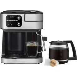 Bring the café home with the Cuisinart Coffee Center Barista Bar, and experience four brew options with compact convenience. Serve friends and family with 12 cups of fresh coffee brewed to perfection with programmable time, temperature, and strength settings. Or go solo with single-serve cups, in 6-, 8-, and 10-ounce sizes, made in minutes and compatible with most single-serve pods. For extra-bold flavor, pop in a Nespresso OriginalLine-style capsule, and enjoy a single or double shot of espresso. Add variety to drinks with the steam wand that makes frothed and steamed milk for cappuccinos, lattes, or the specialty drink of your choice. The wand is also perfect for pouring hot water for tea, matcha, hot cereals, and soups. With sleek modern styling and total versatility, this space-saving all-in-one unit is sure to be the favorite spot in any kitchen.