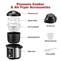 - [Ideal Size & Accessories] This product measures 13.19W*12.80D*12.80H with the pressure lid and 13.19W*12.80D*14.37H with the air fry lid. Accessories included are: Air fry lid, pressure cook lid, measure cup, rice paddle and air fry kit