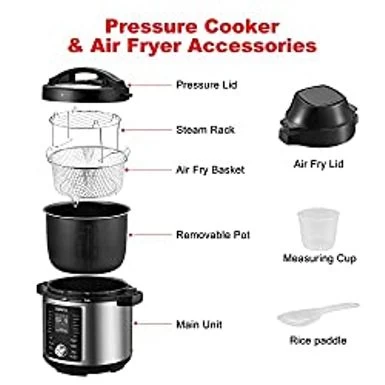 - [2 Removable Lids]This Electric Pressure Cooker and Air Fryer is equipped with 2 removable lids – an air fry lid and a pressure cook lid, which make it easy to switch between an air fryer, pressure cooker, slow cooker or steamer.