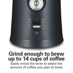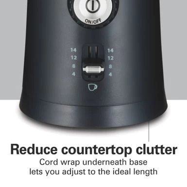 The Hamilton Beach Custom Grind Coffee Grinder lets you conveniently grind coffee hands-free, making it easy to enjoy the taste of freshly ground coffee every morning. The Hamilton Beach Custom Grind Coffee Grinder lets you conveniently grind coffee hands-free, making it easy to enjoy the taste of freshly ground coffee every morning. Just press the button once, and when the grinding is complete, the coffee grinder shuts off automatically. Whether you like your coffee finely or coarsely ground, simply turn the adjustable knob to choose your setting. Select from 5 settings, from coarse to medium to fine. Whether you’re grinding coffee for a quick cup or a full pot, we’ve got you covered with easy-to-select cup settings. Just move the lever up or down to select the number of cups you plan to brew. Choose 4 to 14 cups. With the durable stainless steel blades, this grinder efficiently grinds coffee and your favorite herbs and spices. Cleaning is easy with our dishwasher safe, removable grinding bowl designed with durable stainless steel. Because the bowl is removable, it’s also easy to fill with coffee beans and to pour ground coffee. Keep your countertop neat with the cord wrap underneath the base for adjusting the cord to the ideal length. Includes cleaning brush that stores in the back of the grinder.