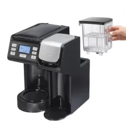 FlexBrew coffeemaker provides versatile brewing options. Two easy-fill reservoirs for 12 cups or 1 cup brewing. Single brewing side lets you brew up to 8″ tall cups or travel mugs. Carafe side features a programmable timer and auto shutoff. Brew a bold or regular strength coffee pot. Water reservoirs feature a water window. Automatic pause and serve. Brews up to 10oz with K-Cup pack or 14oz with ground coffee. Includes single-serve pack holder and brew basket. Dimensions: 13.66″H x 12.25″W x 11.52″D.
