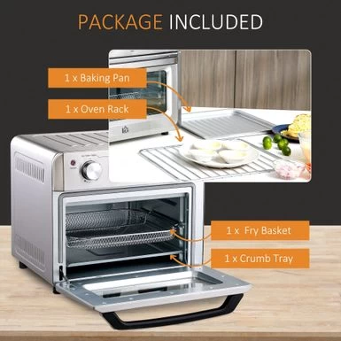 - Three tray options include baking pan for messier meals, oven rack for less clean-up, and fry basket to increase crisp in fried foods