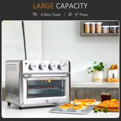 This multi-functional 7-in-1 kitchen accessory features an air frying setting to take the classic mini oven to the next level. A max. temperature of 842 F ensures the widest possible range of recipes including speedy ones in ultra-heat. The tray options cover every basic need, including a fry basket, baking pan, and metal grate, allowing you to cook without cheese melting through the cracks, or fried meals lacking their crisp (hence the fry basket). This quick-cooking bake-master can toast larger items such as bagels, thick bread slices from a loaf, and rolls that might not fit in a regular toaster, adding versatility to the everyday countertop. From crispy perogies to tortilla chips from scratch, your time-saving, impromptu dishes have their new home.