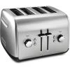 KitchenAid’s KMT4115CU 4-Slice Toaster, in contour silver, has dual independent controls and chrome buttons that glow with blue back-light illumination when in use. The extra-wide slots will accept the thickest bagels, breads, or pastries and the extra-deep, steel toasting cavity ensures even browning. The racks automatically adjust the slot width for thick or thin slices, keeping food upright for even toasting. When your food is ready, the manual high lift lever makes it easy to get it out of the toaster. Selecting the bagel toasting function reduces the power on one side of the heating elements by 50% to produce a better toasted bagel! Plus, the adjustable 5-shade setting ensures your food will pop up just the way you like it.