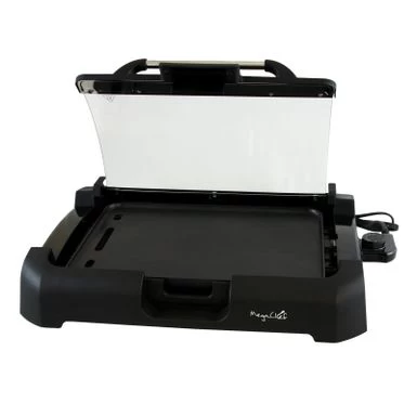 The Megachef Reversible Indoor Grill and Griddle with Removable Glass Lid is designed with a non-stick coating so that you can easily prepare delicious and appetizing meals with less oil than traditional cooking methods. The Megachef Reversible Indoor Grill and Griddle with Removable Glass Lid is designed with a non-stick coating so that you can easily prepare delicious and appetizing meals with less oil than traditional cooking methods. MegaChef understands that no matter the weather outside, friends and family should always be welcome to enjoy juicy grilled meats and vegetables. Rain or Shine, this grill will be your ticket to those perfect grill lines everyone loves to see! The versatility of a reversible cooking surface means you can grill your meats and veggies, flip the grills cooking surface over and use it as a griddle for eggs, pancakes and much, much more!The non stick surface also means that your clean up is a breeze! Simply and easily wipe down any remaining foods with a moist dish cloth and you’re done!This grill is designed to be light weight and easily portable. You can easily take this reversible grill to your next vacation or getaway! The removable, adjustable temperature control accurately sets cooking temperature to achieve desired results when cooking a variety of foods. This grill offers a 15″ by 11″ cooking surface on both sides of the cooking surface panel. Which means you are getting both a 15″ Griddle and a 15″ Grill all in one!A removable glass lid is included for your safety and convenience. You can easily attache and remove the lid as needed to accommodate any cooking style you choose. The lid also features a closing latch to ensure it is not opened accidental and is securely held in place. Once fully opened and secured in the slots where the lid is attached to the grill, it will remain in a secure upright position to avoid the the possibility of closing.* Item Dimensions: 19.50″ L x x14.50″ W x 3.50″ H