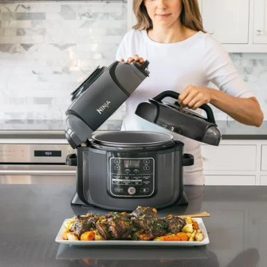 The Ninja Foodi, The Pressure Cooker That Crisps. With TenderCrisp Technology, you can achieve all the quick cooking and tenderizing wonders that you love about pressure cookers. But where they stop, the Foodi is just getting started. Its revolutionary Crisping Lid allows you to air fry, bake, roast, and broil. That means you can pressure cook to lock in juices, then finish with a crisp. Only the Ninja Foodi gives you the best of pressure cooking and air frying, all in one pot. Transform frozen foods to crispy meals. Create wholesome, multi-textured 360 meals by cooking proteins, veggies, and grains all together. Elevate your favorite stew and chili recipes by adding a crispy or bubbly top to make one-pot wonders.