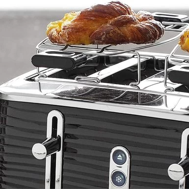 From the heart of England to the heart of your home, the Russell Hobbs Coventry 4-Slice Toaster brings premium aesthetics to your kitchen. The variable browning control ranges from 1 (light) to 6 (dark) to satisfy all preferences. From the heart of England to the heart of your home, the Russell Hobbs Coventry 4-Slice Toaster brings premium aesthetics to your kitchen. The variable browning control ranges from 1 (light) to 6 (dark) to satisfy all preferences. Choose the Bagel function for a perfectly toasted cut side with a warmed bottom side, or the Frozen setting for fresh-like results. This toaster comes with a removable warming rack that quickly heats buns, pastries, and rolls. Plus, the removable crumb tray ensures easy cleanup.