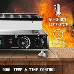 - PRECISE TEMP & TIME CONTROL- The pancake maker machine commercial is equipped with two thermostats and 5-minutes timer setting, providing separate control of two different areas. The temperature range is 50-300 (122-572).