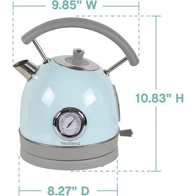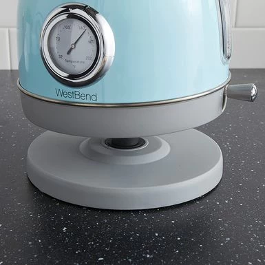 The West Bend 1.7L Electric Kettle adds an elegant retro-style atmosphere to your kitchen decor. With premium stainless steel body, spout and filter, this kettle not only delivers great looks, but it also gives you the confidence to know that it is well-constructed and durable. The 1500 Watts of power rapidly boils water for coffees, teas, cocoas, snacks, soups and so much more! The clear-view water indictor window lets you know exactly how much to fill and also gives you a fast reference to know how much hot water you have left for serving. The large temperature gauge lets you see in a quick glance the precise temperature of boiling water so that you can accurately have the optimal temperature for teas or pour over brewing. When it is time to brew, the lift n serve kettle swivel base gives you pick up n pour cord-free convenience whether youre pouring in the kitchen or table side. The convenient cord storage keeps the cord wrapped and out of sight. And for your peace of mind, this kettle offers boil dry protection as well as a power switch with auto shut-off.