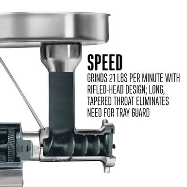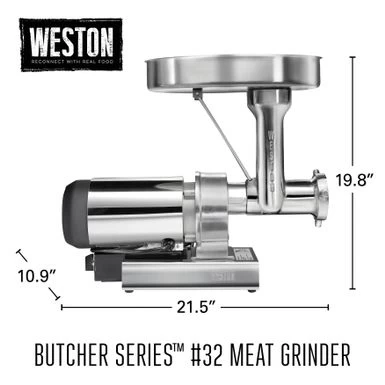 Grinding large volumes of meat fast is no problem with the Weston Butcher Series #32 Meat Grinder & Sausage Stuffer. This commercial-grade meat grinder has a powerful 1.5 hp, 1125 watt motor that is air cooled and permanently lubricated to continuously grind large volumes of meat without stopping. With a rifled-head design and tapered throat that eliminates the need for a tray guard, it grinds meat as fast as you can feed it up to 21 lbs. per minute. Grind all kinds of meat including beef, pork, venison, and bison. The forward-reverse mode is useful for grinding tougher meats and meats with connective tissue. Make fresh-ground hamburger, blend pork with other meats like venison for sausage, and grind meat for meatloaf, chili, and more. The grinder is engineered for quiet performance and rugged durability to process hundreds of pounds of meat. It includes a patented auger-grabbing stomper, coarse (7 mm) and fine (4.5 mm) stainless steel plates, a grinder knife, and a sausage stuffer kit with adapter spacer and four-sized funnels. The Weston Meat Grinder is ideal for hunters, farmers who raise animals for food, small retail butchers, and anyone who takes pride in a self-sustaining approach to food.ย